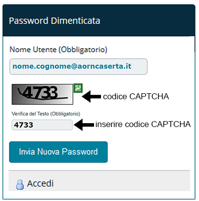 (nome.cognome@aorncaserta.it ) e un codice CAPTCHA. Premendo il bottone ‘Invia Nuova